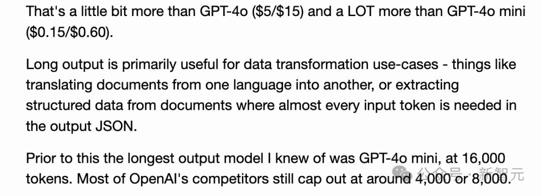 研究员Simon Willison表示,长输出主要用于数据转换用例。