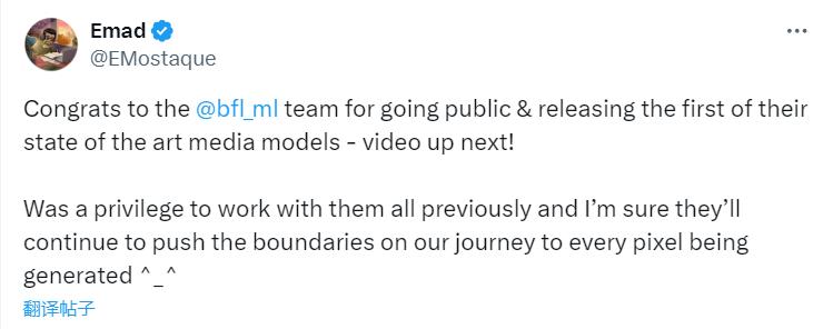 创始团队的前领导——Stability AI前CEO埃马德·莫斯塔克(Emad Mostaque)也发来贺电,还说“之前能与他们合作是我的荣幸,我相信他们会继续在生成每一个像素的旅程中突破界限”。