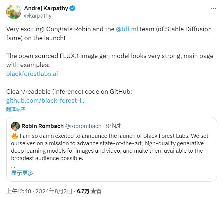 刚刚创业的AI大神安德烈·卡帕西(Andrej Karpathy)为黑森林团队送上祝福,并称“开源的FLUX.1图像生成模型看起来非常强大”。
