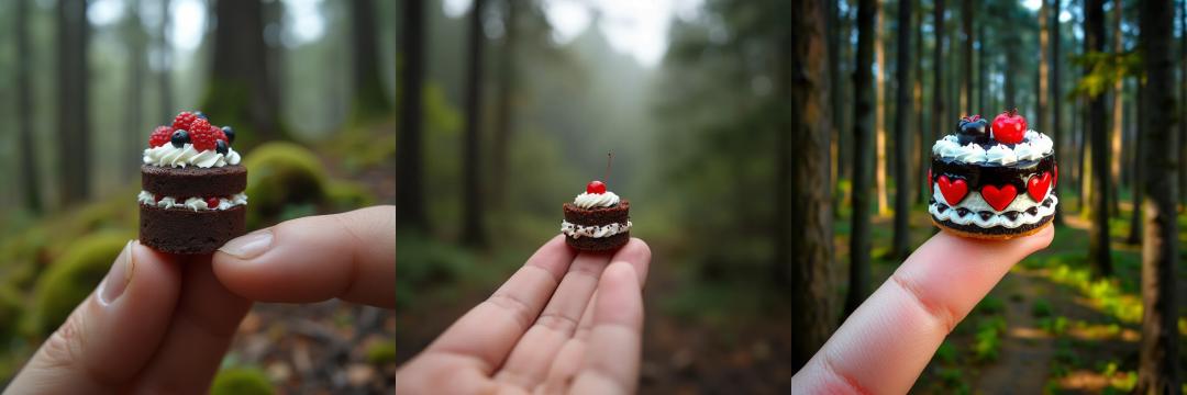 FLUX.1现已在开源平台Replicate上可用,以下是我用提示词“世界上最小的黑森林蛋糕,手指大小,被黑森林的树木包围”,在三款模型上生成的图像,用时分别为17.5s、12.2s、1.5s。