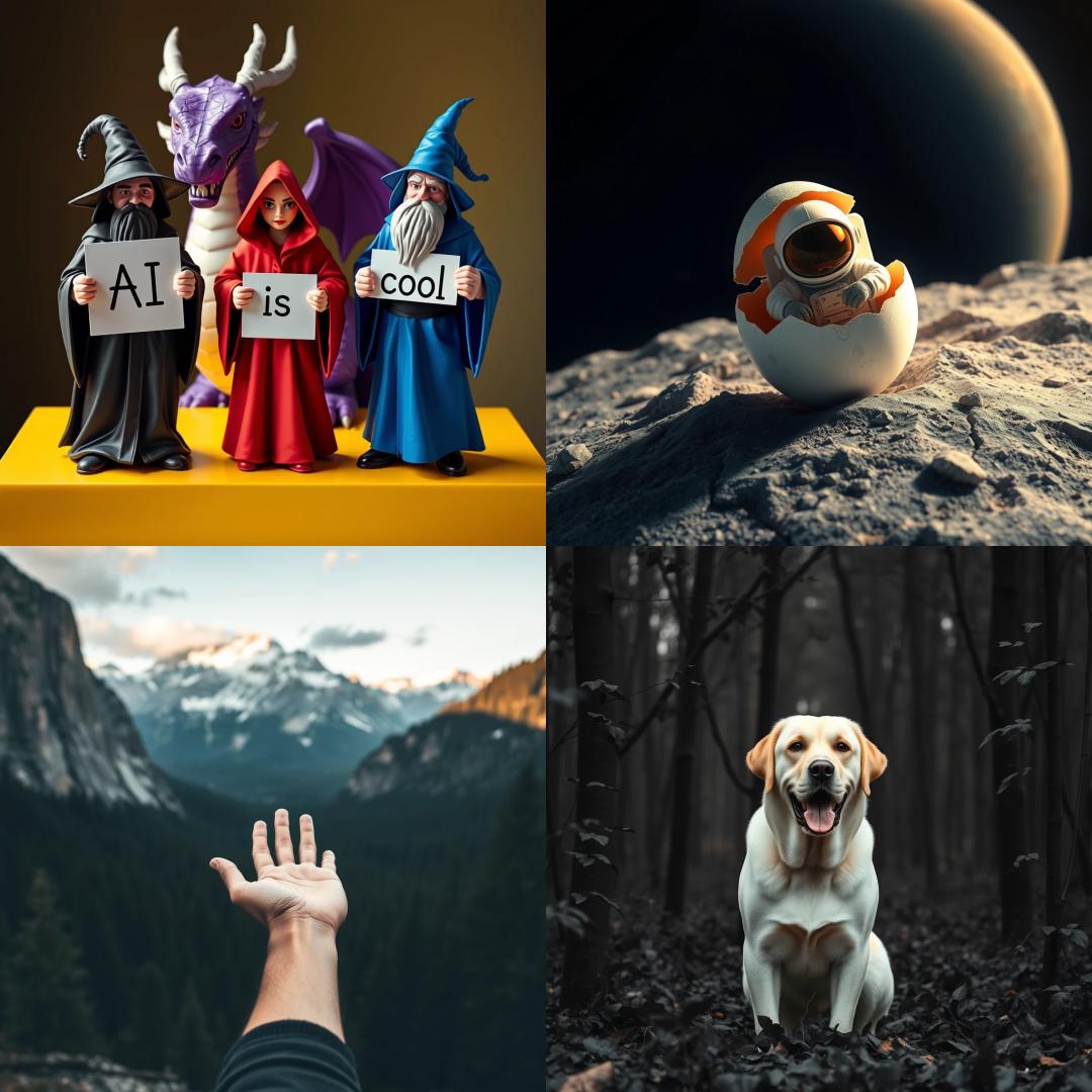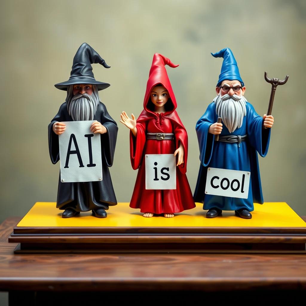 在构图方面,FLUX.1擅长按照图像中事物应该位于哪里等复杂指示进行操作。例如,FLUX.1完美地演绎了这段提示词:三个魔法巫师站在一张黄色桌子上,每个巫师都拿着一个标志。左边,一个穿着黑色长袍的巫师拿着一个写着“AI”的标志;中间,一个穿着红色长袍的女巫拿着一个写着“is”的标志;在右边,一个穿着蓝色长袍的巫师拿着一个写着“cool”的标志。