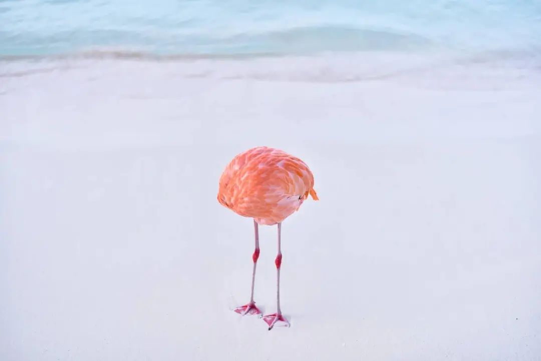 拍摄地点在阿鲁巴岛,定格的画面里,这只火烈鸟弯下脖子,用喙挠自己的肚子,似乎没有头,看起来像很多 AI 图片一样,有些不真实。