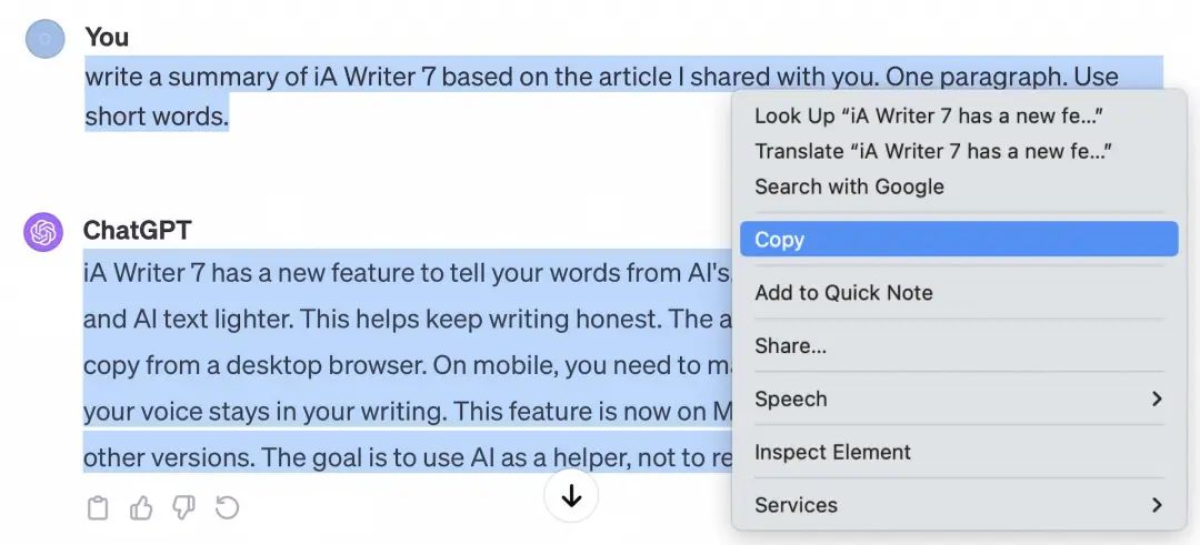 使用这个功能不难,同时复制提示词和回答,iA 就能自动将 AI 生成的内容标记为灰色,但我们也可以手动操作。iA 很佛系,「对自己有多诚实取决于你自己」。