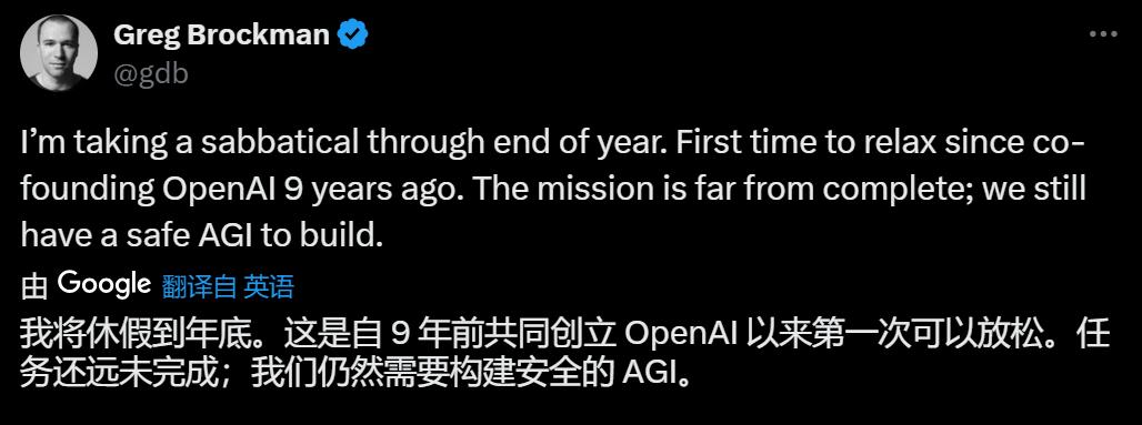 Greg Brockman大家应该很熟悉了,被誉为“OpenAI的总设计”,也是公司总裁,前几次OpenAI陷入舆论危机,他都站出来坚定不移的支持阿尔特曼,这次据报道Greg Brockman称自己将休假到年底。
