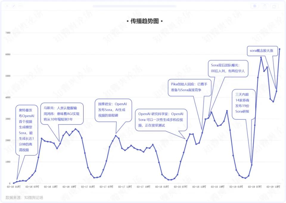 今年2月份,Sora发布时,其热度可以用炸裂来形容。根据知微数据,“Sora"发布首日上榜热搜32次,累计热度6600万。5日内,相关话题上榜热搜超百次。