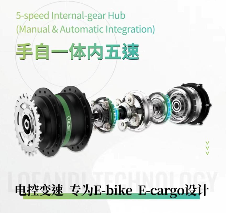 除却轮毂电机内三新品,洛梵狄的第二款新产品是手自一体内五速,可以根据转速智能自动换挡,也可以手动变速,应用于高端eBike产品,拥有2.49倍变速比。