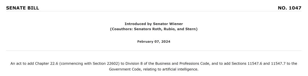 法案链接:https://leginfo.legislature.ca.gov/faces/billTextClient.xhtml?bill_id=202320240SB1047