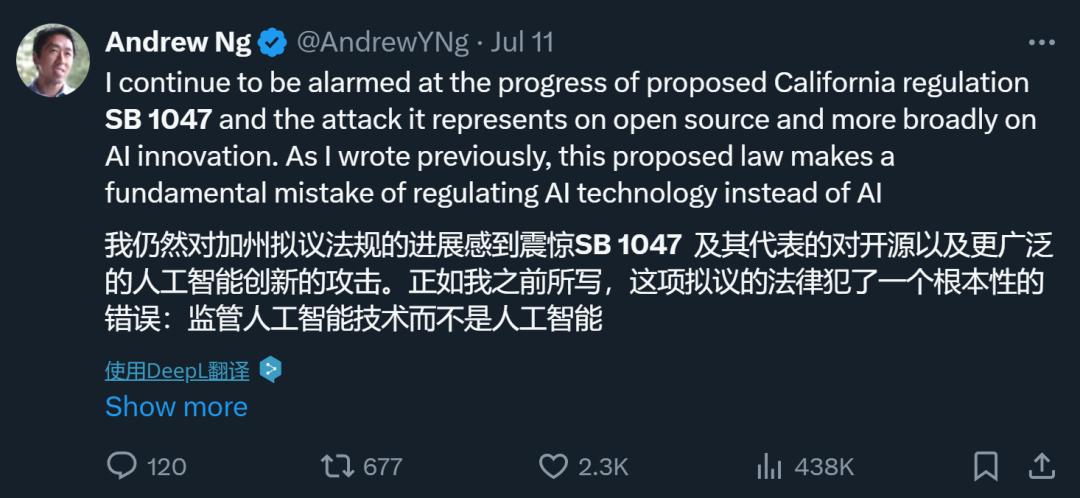 此前,吴恩达也多次就此事发声。他认为,监管机构应该监管应用而不是技术。例如,电动机就是一项技术。当我们将其放入搅拌机、电动汽车、透析机或制导炸弹中时,它就成为了一种应用。想象一下,如果法律规定,当任何人以有害的方式使用电机时,电机制造商都要承担责任。那电机制造商要么停产,要么将电机制造得非常小,以至于对大多数应用来说毫无用处。如果我们通过这样的法律,可能会阻止人们制造炸弹,但我们也会失去搅拌机、电动汽车和透析机。相反,如果我们关注特定的应用,就可以更合理地评估风险并判断如何确保它们的安全,甚至禁止某些类型的应用。