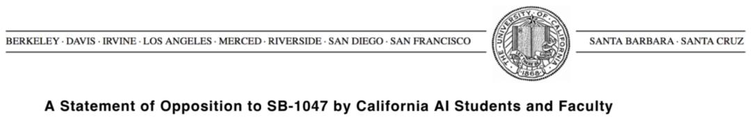 针对 SB-1047,除了李飞飞,由加州大学 7 个校区的师生以及来自其他 20 多个机构的研究人员组成的团体也在积极行动。他们共同起草并签署了一封反对 SB-1047 的公开信,从研究者的角度出发,陈述该法案对加州人工智能研究和教育目标的损害。