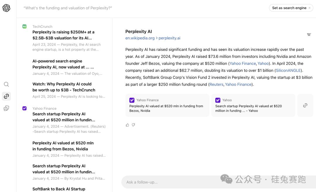 SearchGPT善于处理的问题,例如:“Perplexity的融资和估值信息”,这样指向明确、答案限定的问题。