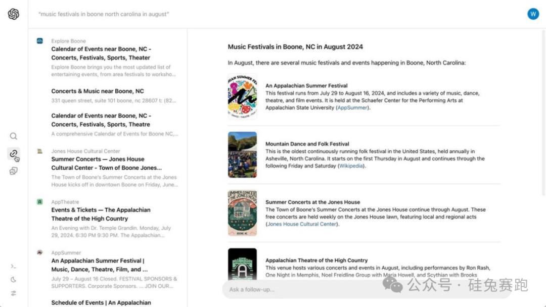 有用户在SearchGPT中输入“ 8月份北卡罗来纳州布恩的音乐节”,结果中第一个显示的是阿巴拉契亚夏季音乐节,并且将从今年7月29日至8月16日举办一系列艺术活动。