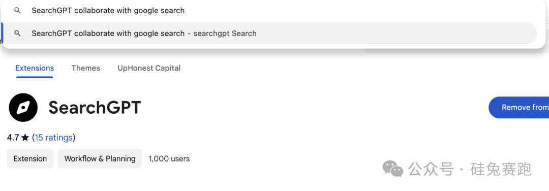但SearchGPT准备了一项杀手锏用以撬动用户—— 即如果选择将SearchGPT设为搜索引擎,链接会跳转至谷歌浏览器的小程序应用商店(Chrome Web Store),选择将之集成到浏览器后,谷歌浏览器原本默认的Google Search会变为SearchGPT。