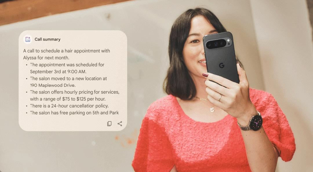 大模型的智能通话记录现在也被集成在了安卓系统重。Clear Calling 功能进一步提高了音频质量,新的通话记录(Call Notes)功能会在用户挂断电话后立即发送私人摘要和完整的通话记录。因此,当你接到回电时,无需手忙脚乱地寻找纸笔进行记录。为了保护隐私,通话记录完全在设备上运行。