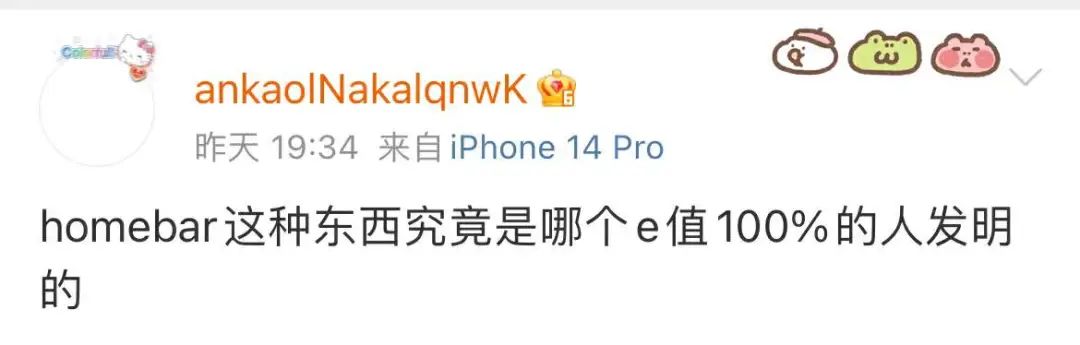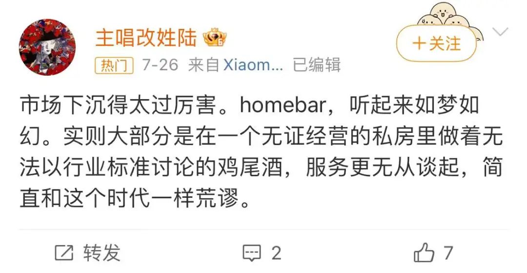 说是homebar,做不到在home也就罢了,有些更是当bar都不够格。前不久就有网友辣评homebar酒难喝:“花了168得到一杯泡沫比老板头还秃的特调,泔水味道比我中午吃的快餐大,问老板创作理念,他还扯上什么分子调酒。”