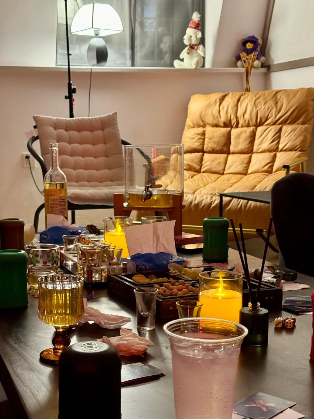 黄昏般的暖光下,一群年轻人围坐在低矮的长桌旁东倒西歪,桌上杂乱摆着五花八门的游戏卡牌和五光十色的鸡尾酒杯,耳边响的是小众电影经典对白,身边坐的是刚认识不超过一小时的新朋友……