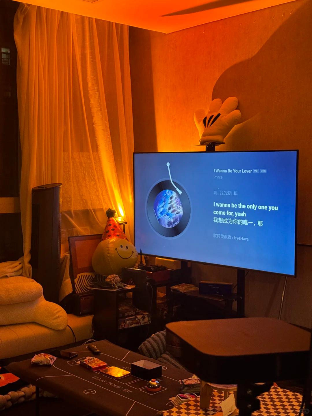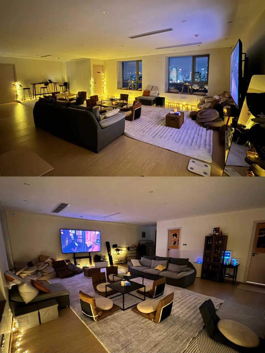 地上铺着素色的羊绒地毯,房间里点缀着暖黄色的蜡烛和小灯;蓝牙音箱里放着英文歌,投影仪始终在播电影;客厅中心是一张低矮的长桌,桌边是坐一屁股就陷进去的豆袋沙发和彩色靠垫。