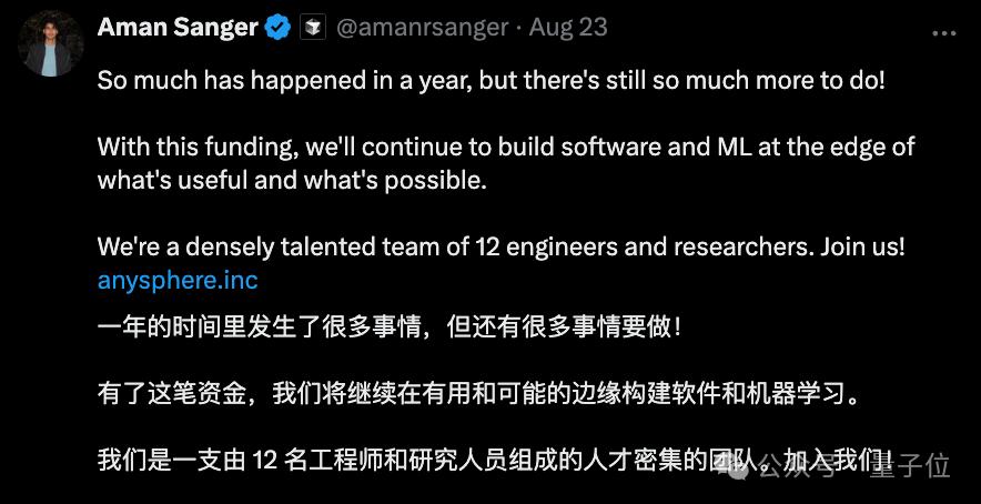 在2023年8月,Cursor团队还只有5个人。甚至在今天,这支团队依然小而美:由12名工程师和研究人员组成。