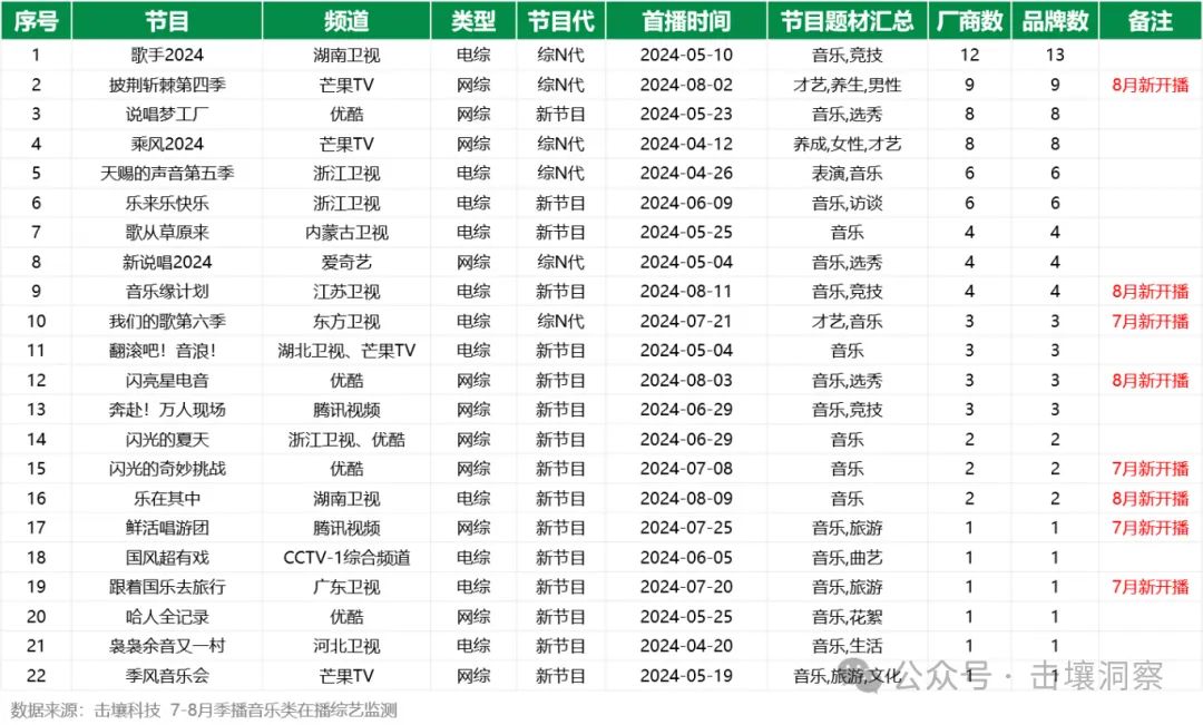 据击壤数据,暑期共计有80+档季播综艺在播,200+品牌投放,广告主逐渐回归综艺赛道。其中音乐类格外受青睐,且新节目的产出数量也最为突出,在7-8月播出的22档音综中有8档为新开播节目。