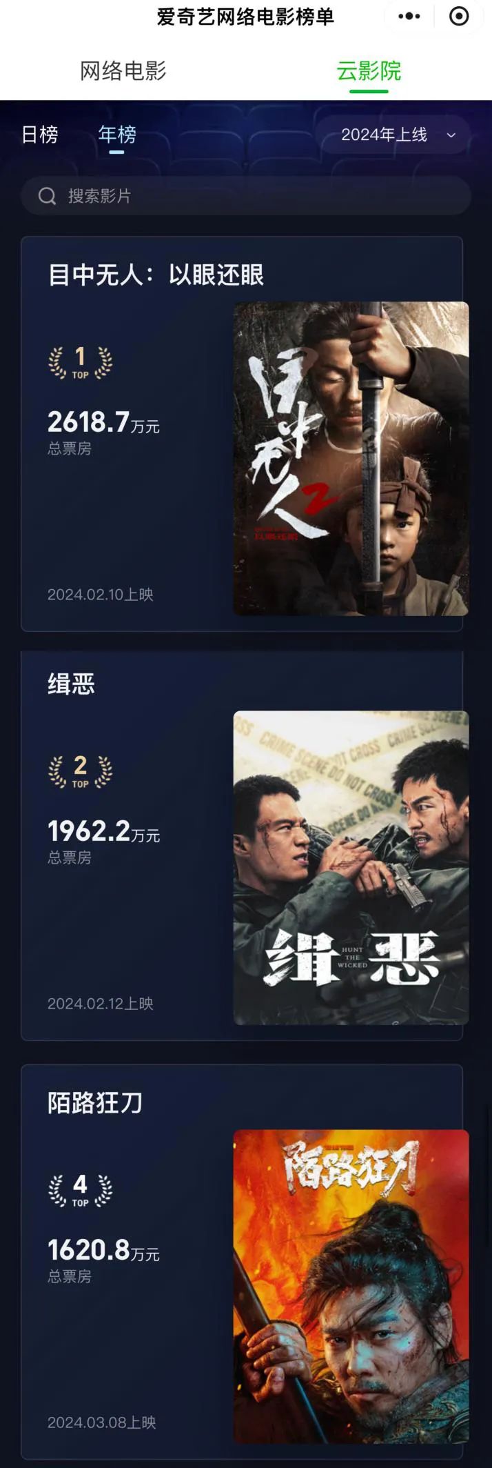 截止发稿前,《目中无人2》《缉恶》《陌路狂刀》分别占据了爱奇艺云影院2024首映电影票房榜第1、2、4位,首季四部作品的线上总票房收入已超6800万元。