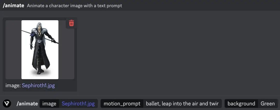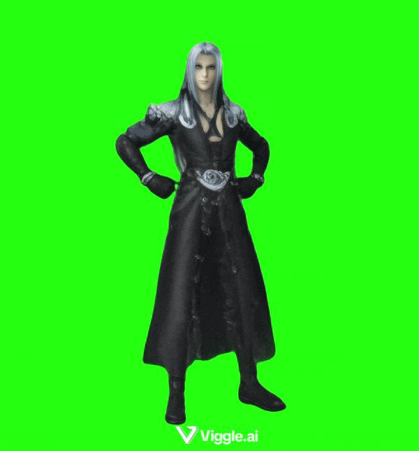 我上传了一张《最终幻想》萨菲罗斯的图片,输入文字提示词:ballet, leap into the air and twirl(芭蕾舞,跳跃并旋转),背景选择绿幕。
