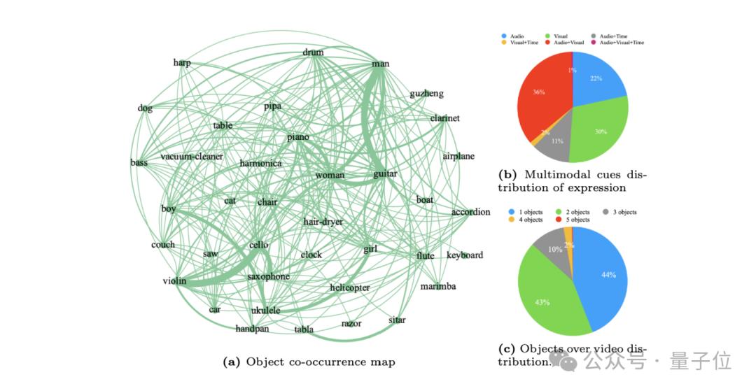 为了确保所指代对象(Object)的多样性,团队选择了包含背景的52个类别, 其中48个类别的可发声物体,以及3个类别的静态、不可发声物体。
