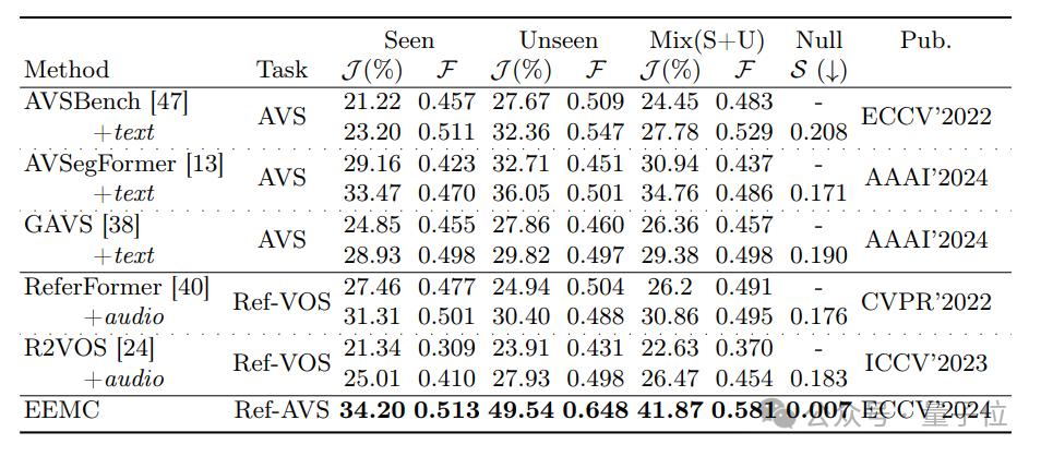 同时在Unseen子集和Null子集上,Ref-AVS展示了可泛化性,并且可以准确地跟随指代表达。