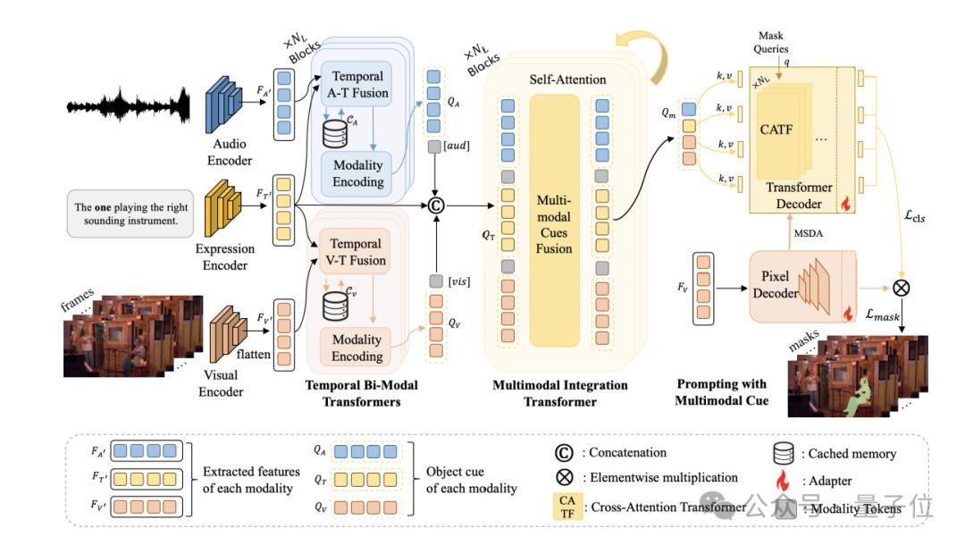 完成了数据集准备后,团队利用多模态线索来增强表达式指代能力(Expression Enhancing with Multimodal Cues, EEMC),以实现更好的视听指代分割。