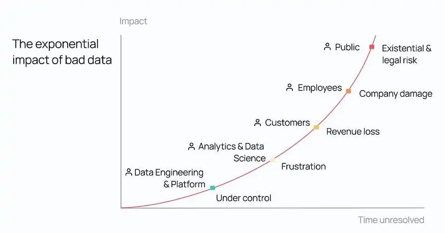 如果数据问题得不到解决,就会在整个组织内蔓延。这些问题从技术团队开始,最终影响到业务用户和公司整体。随着时间的推移,影响会逐渐扩大——从小规模的运营效率低下到广泛的组织混乱、客户不满和潜在的法律风险。尽早发现和解决问题是阻止问题升级的关键。这表明需要进行主动的数据质量管理,以保护业务健康和完整性。