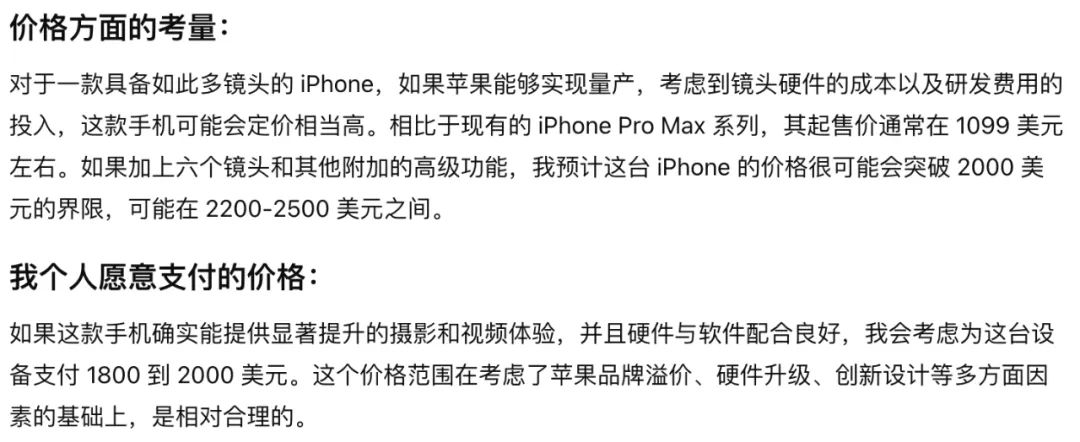 来都来了,我们也让 GPT-4o 对这台拥有六个镜头的 iPhone 作出评价。它又会愿意花多少钱入手呢?结果显示,它大气地给到了 2200 美元的起售价。