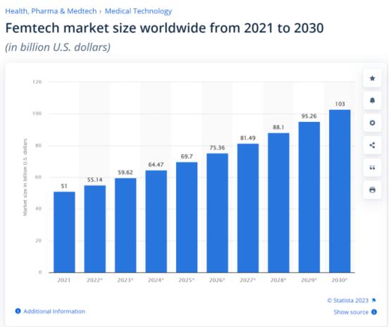 statista数据显示,2021年,全球女性科技市场价值约为510亿美元。据预测,到2030年,全球女性科技市场价值将达到1030亿美元,2022年至2030年复合年增长率为8.1%。