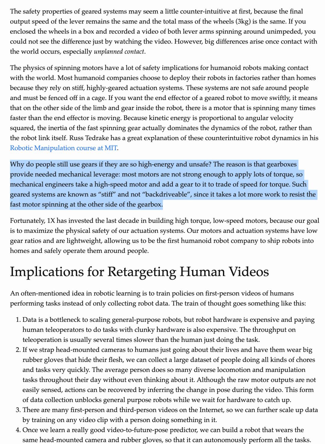 这就解释了为什么目前很多双足机器人只能在工业场景使用:“大多数人形机器人公司选择在工厂而不是家庭中部署他们的机器人,因为它们依赖于僵硬、高度齿轮化的驱动系统。这些系统在人群周围并不安全,必须用笼子围起来。”