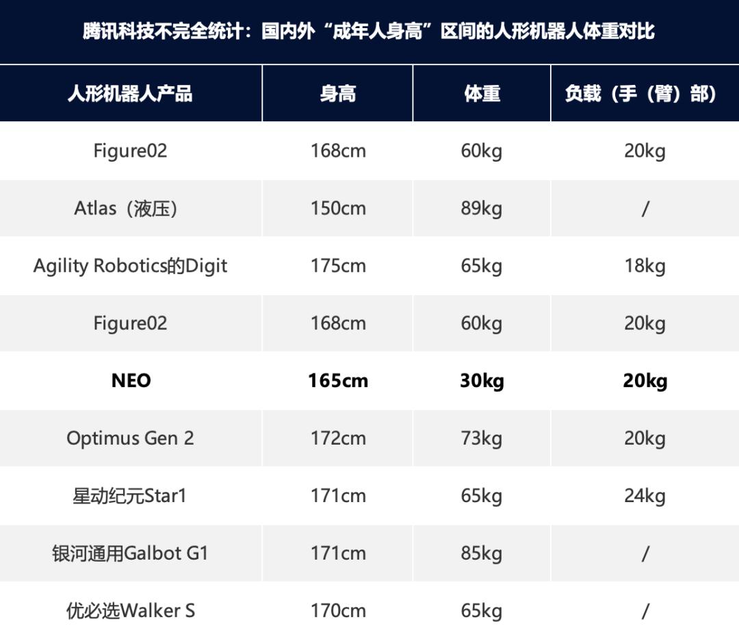 NEO身高1.65米,全身拥有55个自由度,它的体重只有30公斤,几乎比大部分同级别身高的人形机器人轻1/3~1/2,但是NEO的力气并不小,据Medium报道,NEO负载20公斤,其握力足以举起70公斤(154磅)的重物。