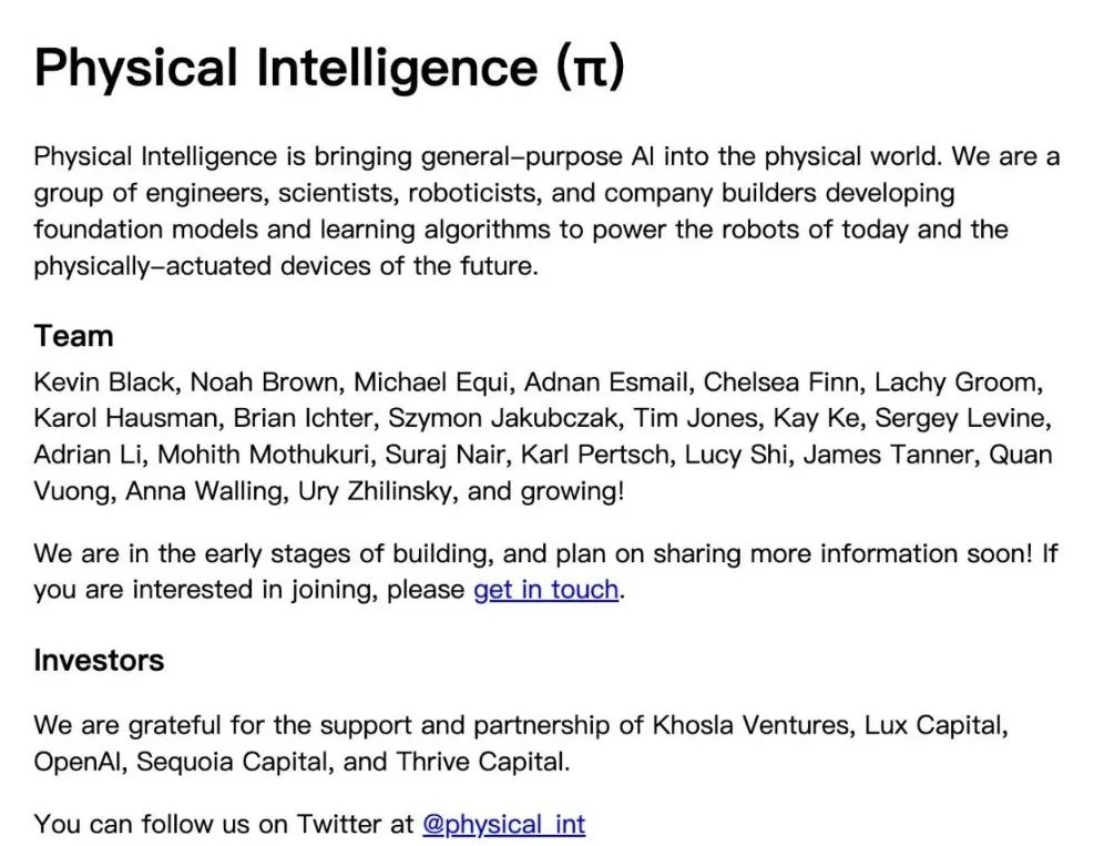 另一家被投公司Physical Intelligence虽然到目前为止都只有个网页,没有产品。但在采访中,这家公司表示其愿景就是“构建一个通用的人工智能模型,而非为在仓库或工厂执行重复任务的机器人提供动力,该模型可广泛应用于多种场景。”