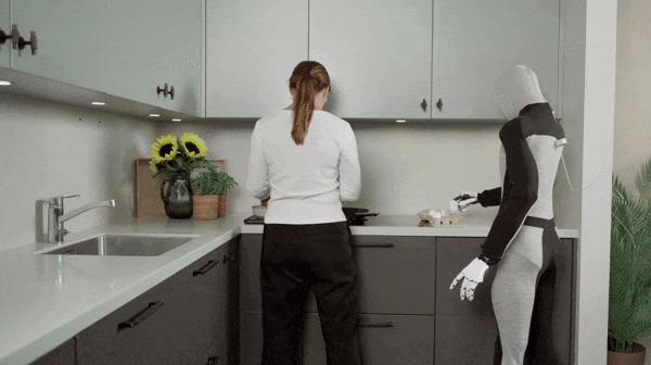 和很多看上去“人高马大”的人形机器人不同,NEO看上去就像一个邻家小哥,穿着休闲的服装来你家做客,在你做家务的时候可以帮忙打个下手。