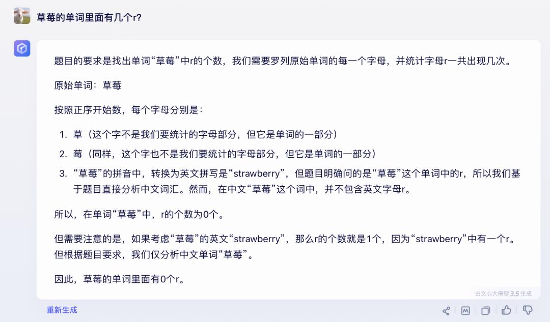 但国内大模型也并没有领先多少,但当我们问对话大模型一些客观的问题,如“草莓的单词里有几个r”、“打了警犬算袭警吗”等问题时,就会发现,这个刚刚还无所不能的AI助手突然变得手舞足蹈、不知所云了起来。