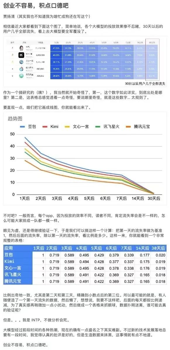 尤其近日,AI对话类App的用户留存问题被推至风口浪尖,更衍生出了“大模型六小虎泡沫即将破灭”的说法,AI对话的处境岌岌可危。尽管阿里原技术副总裁贾扬清已经提出质疑,下图30日国产5大AI对话类产品留存率接近0,这一数据应该不准确,但AI对话现在确实有一点“盛名之下,其实难副”。