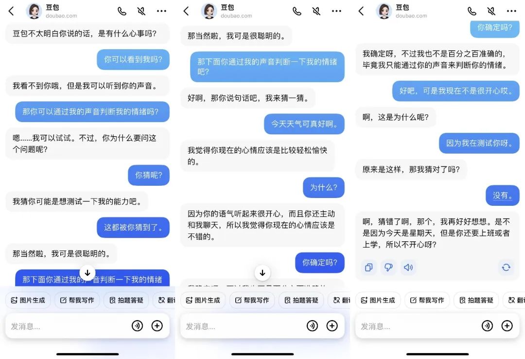 但国内月活第一的豆包APP的互动能力却稍显逊色。豆包虽然能识别语音,并进行对话,但其生成速度却不及GPT,百度的文心生成速度则更慢。不仅如此,豆包也无法识别对话过程中的语气。AI鲸选社在与豆包交流时,用很沮丧的语气说“今天天气可真好啊”,可豆包却判断出对话者的情绪是不错的。