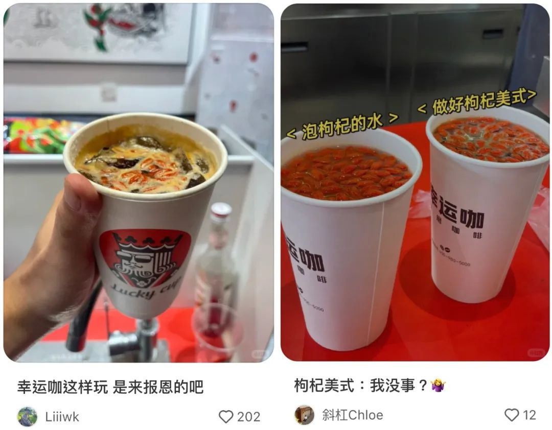 蜜雪冰城旗下的咖啡品牌「幸运咖」曾推出枸杞美式,「咖啡配枸杞,暖暖超给力」的slogan一度被网友奉为「整活典范」。
