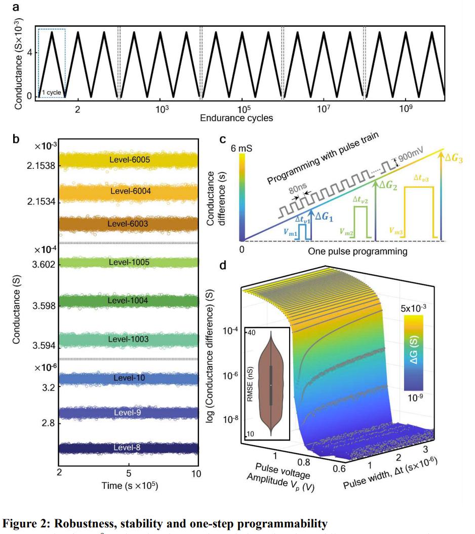 总之,该器件实现了想要的功能,并且具有相当好的非易失性和稳健性。如图 2a 所示,这个交叉开关矩阵耐久性很好,经过 10^9 个操作周期后,权重更新特性依旧保持不变。另外,图 2b 表明使用 500 mV 直流电压在 85°C 环境下,该结构能在 11 天内不出现明显的电导漂移。另外,他们还测试发现,其能维持长达 7 个月的电导保持率。