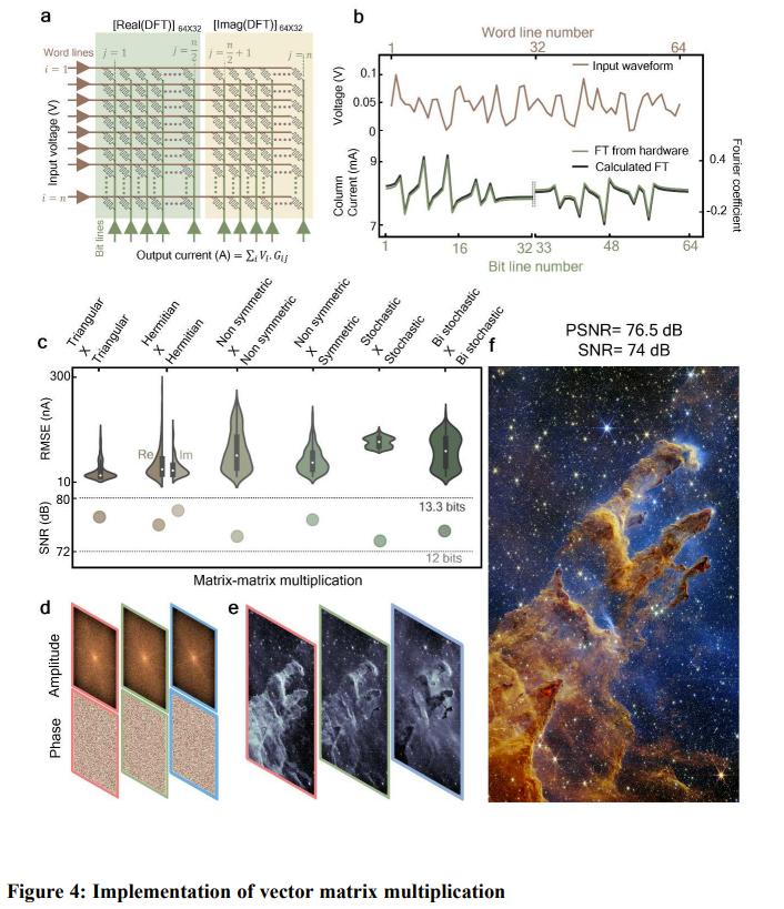 使用这个 64×64 的分子交叉开关矩阵,该团队执行了 VMM 实验,这用到了一个他们定制的超过 16 比特准确度的混合信号外围电路,如下图 4 所示。a 图是对其编程,使之执行离散傅里叶变换(DFT)。b 图则比较了计算出的 DFT 输出与软件计算的结果,可以看到它们之间非常一致,这表明这个结构是有效的。