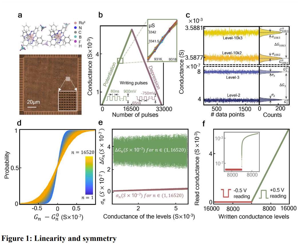 该团队宣称已经发明出了这样的元件。这是一种分子忆阻器交叉开关矩阵,可集成在电路板中。其展现出了 14 比特的模拟精度、近乎理想的线性和对称权重更新,以及每个电导层级的一步式可编程性(one-step programmability)。