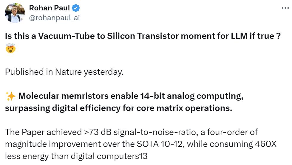 这样的出色表现让 AI 工程师 Rohan Paul 忍不住惊叹:「如果这是真的,算是到了 LLM 的真空管变硅晶体管时刻吗?」