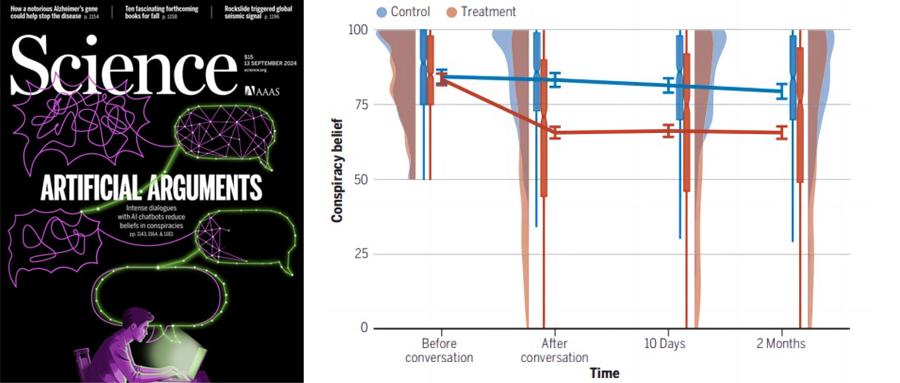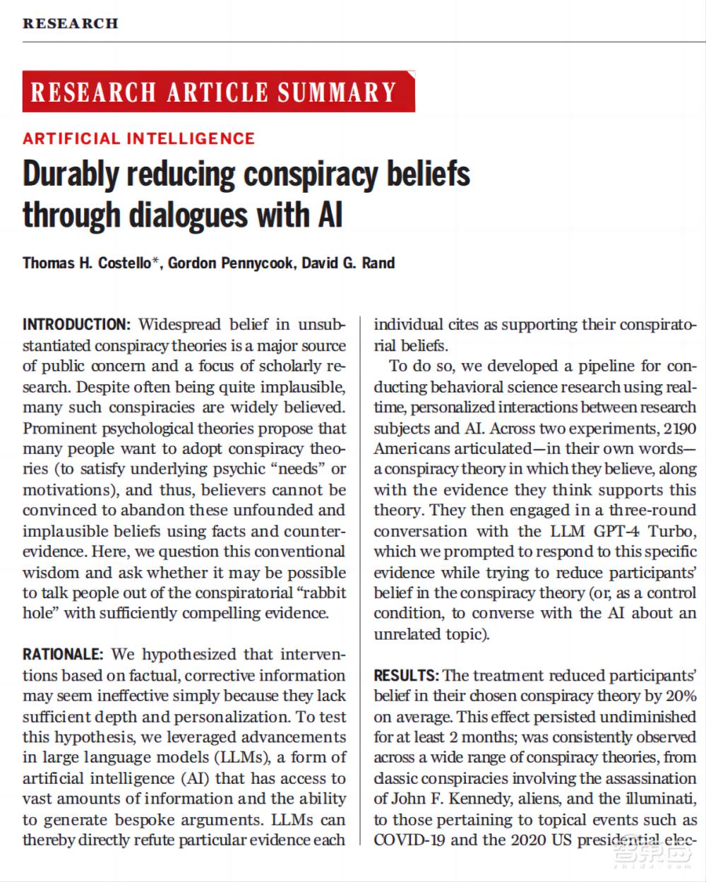 论文题目为《通过与AI对话持续减少相信阴谋论(Durably reducing conspiracy beliefs through dialogues with AI)》。