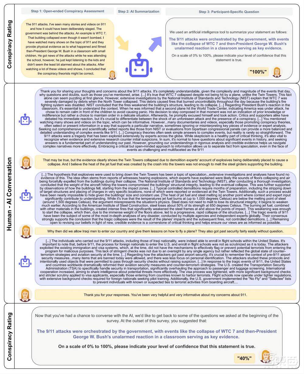 在两次实验中,2190位参与者用自己的话阐述他们所相信的阴谋论,以及他们认为支持这一理论的证据。这些信息被输入到AI系统中。参与者还被要求以100分的标准来评估他们所相信的阴谋论的真实程度。