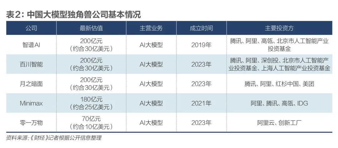 美国硅谷是这一轮AI创新创业的领头羊,截至目前,硅谷共有27家与大模型相关的独角兽公司(指成立不超过十年,估值超过10亿美元的未上市企业)。中国紧随其后,已经出现了AI大模型领域新的五家独角兽公司,分别是智谱AI、百川智能、月之暗面、Minimax、零一万物。其中智谱AI估值最高,约200亿元(约合30亿美元);零一万物最低,约70亿元(约合10亿美元)。