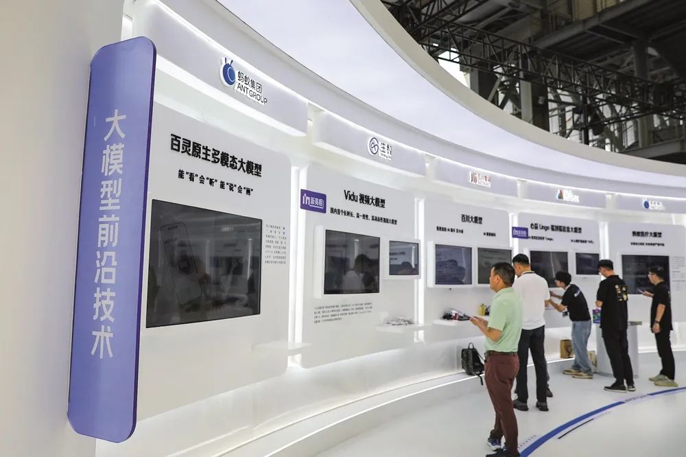 2024年9月6日,上海2024外滩大会上展示的部分大模型技术:蚂蚁集团(百灵原生多模态大模型)、生数(Vidu视频大模型)、百川智能(百川大模型)等。图/IC
