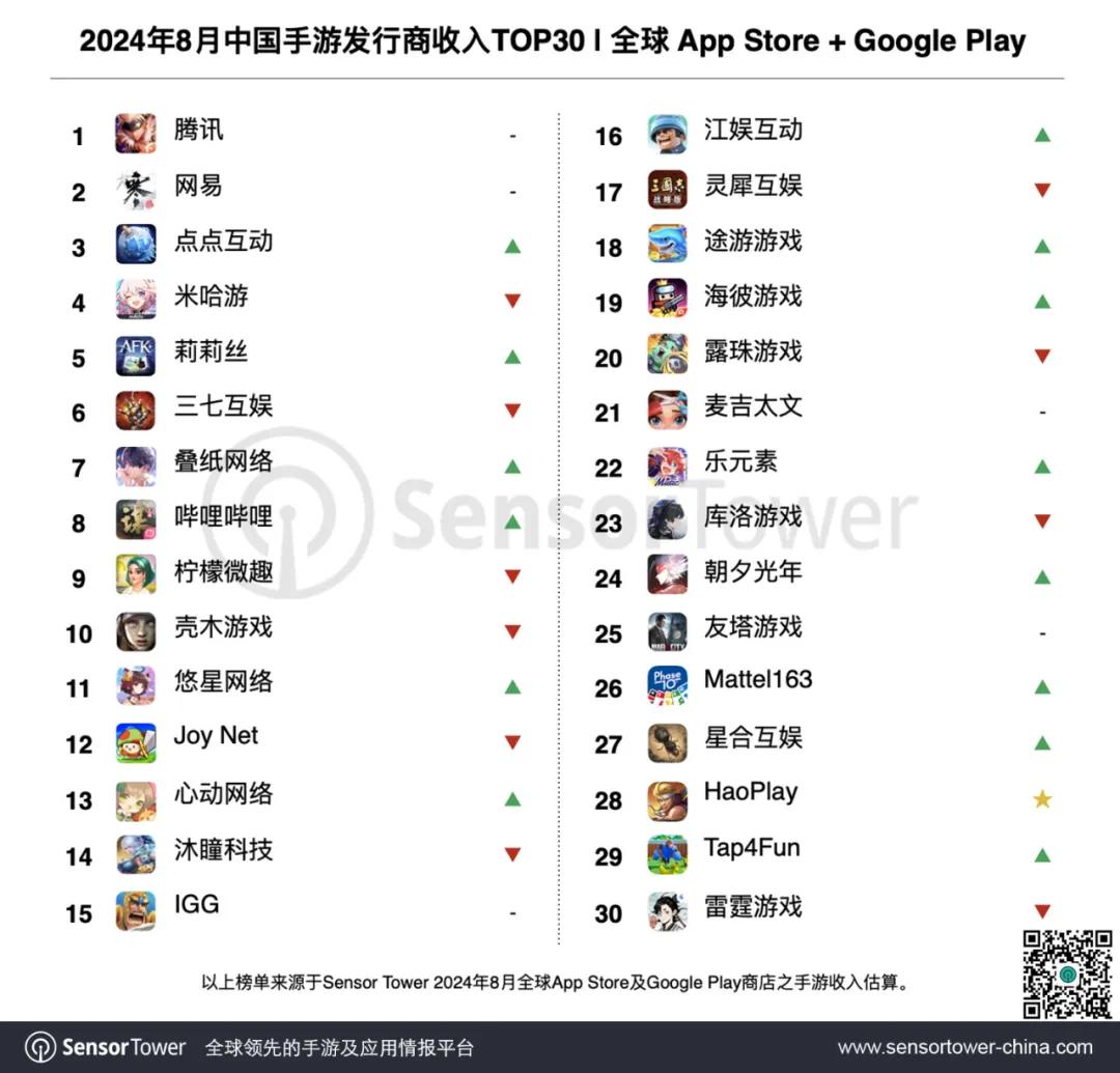 今天(9月18日),Sensor Tower发布了2024年8月中国手游发行商在全球App Store和Google Play的收入排行TOP30(以下简称TOP30,仅统计发行商收入,且不包括中国地区第三方安卓渠道)。