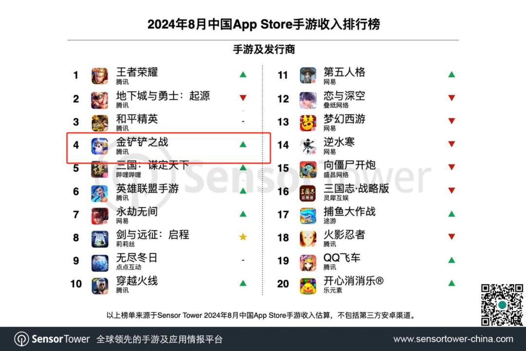 众多内容刺激下,使得《金铲铲之战》全月收入激增139%,跻身中国iOS手游收入榜第4名。