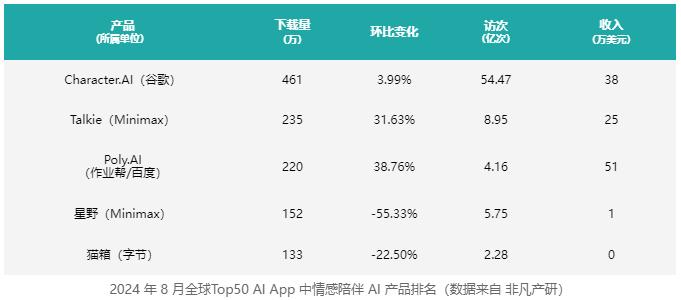 根据非凡产研发布的 AI 产品流量榜单数据显示,2024 年 8 月 Top50 的 AI App 中,共有 6 款情感陪伴类 AI 产品上榜。除了上述提到的 C.ai 以 54 亿次的访问量遥遥领先,后续二到五名 AI 产品 均为国产 AI App,背后站着百度、Minimax、作业帮、字节等不同的大中厂。