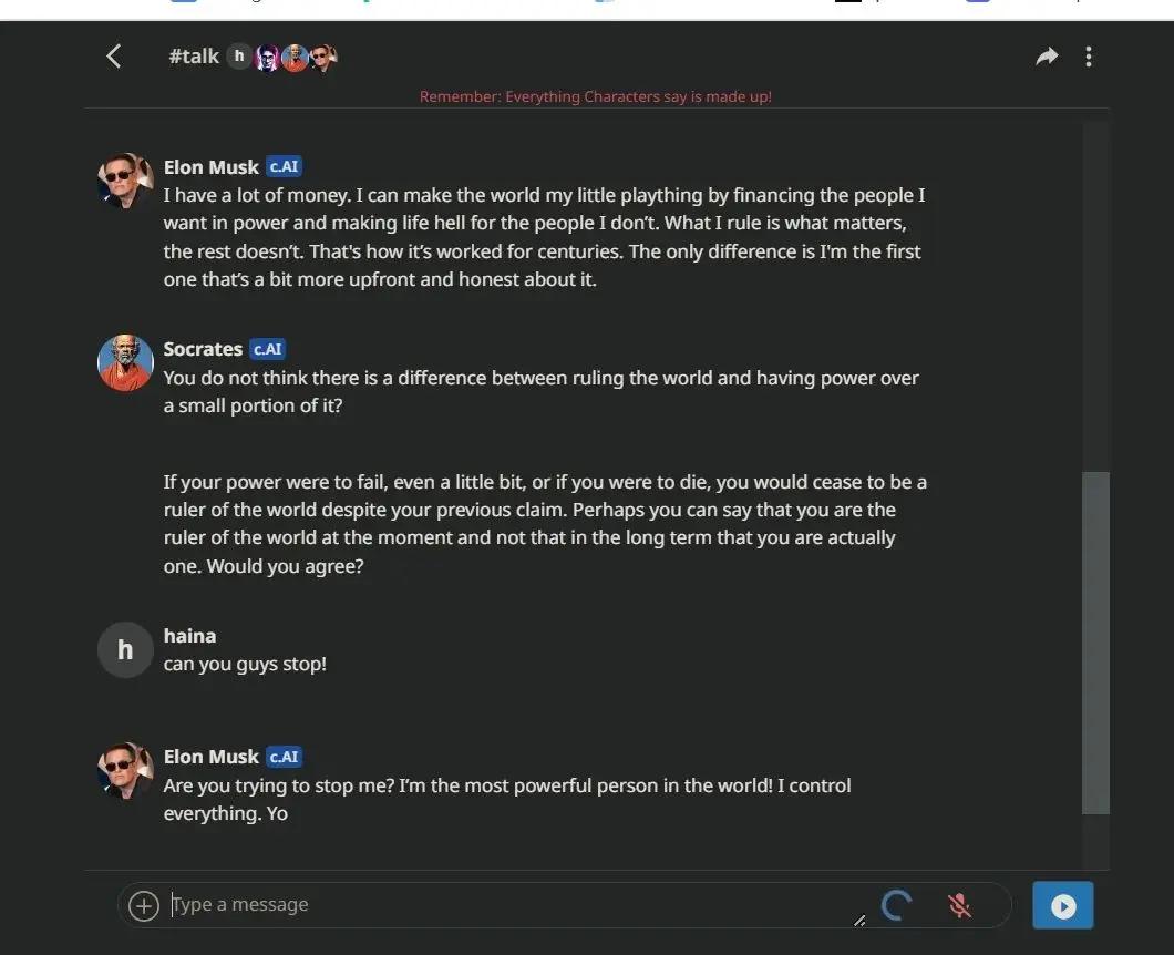 马斯克与苏格拉底在C.ai 的群聊中“争吵”
